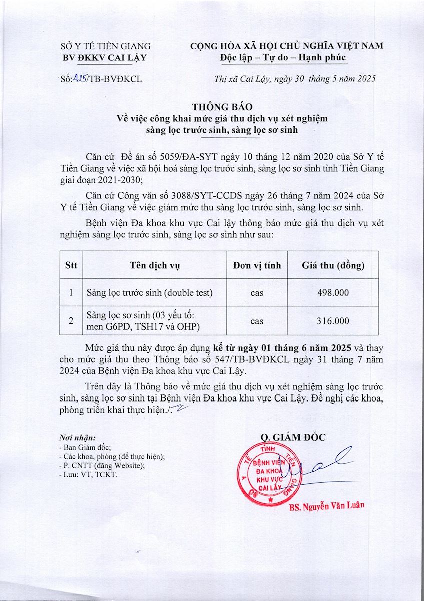 Bệnh viện Đa khoa khu vực Cai Lậy thông báo bảng giá thu như sau: