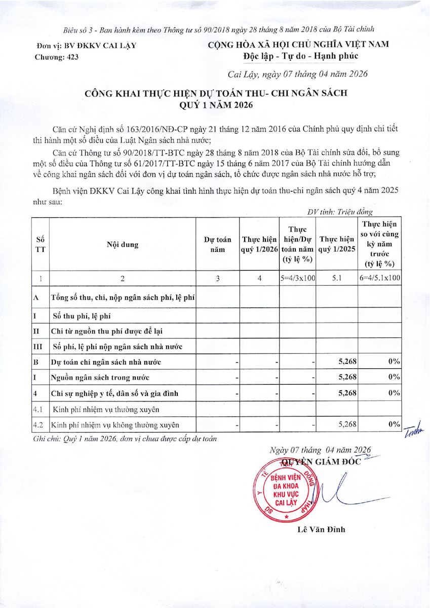 Bệnh viện Đa khoa khu vực Cai Lậy công khai tình hình thực hiện dự toán thu - chi ngân sách quý 4 năm 2025 như sau: