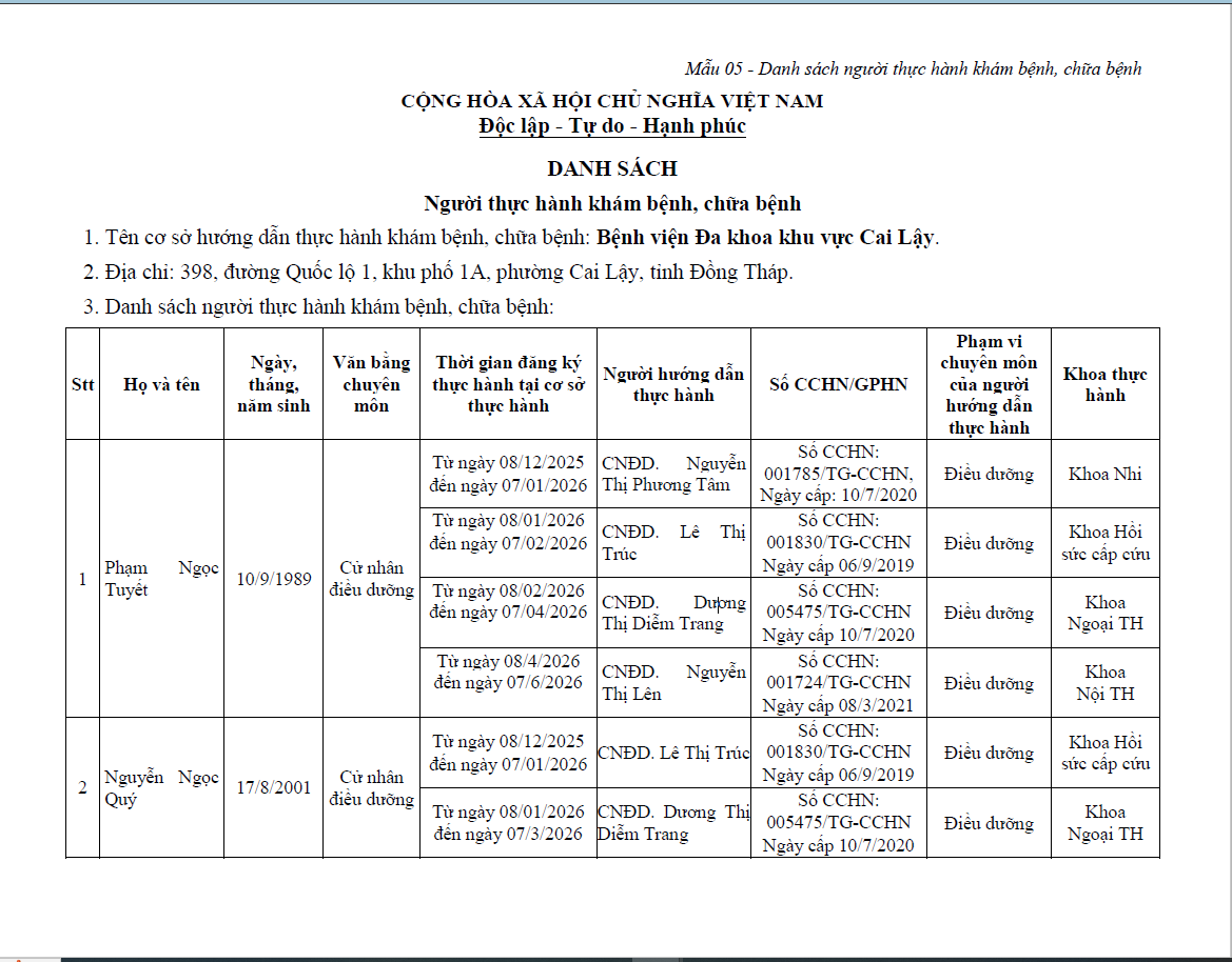 Danh sách người thực hành khám bệnh, chữa bệnh điều dưỡng ngày 15/12/2025