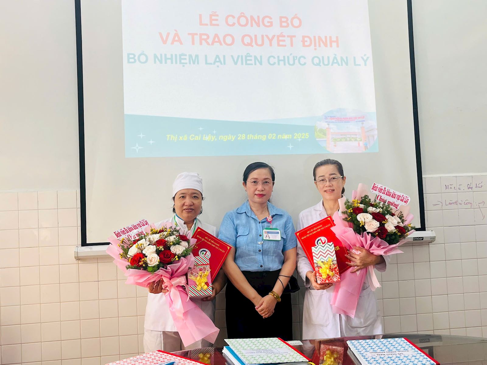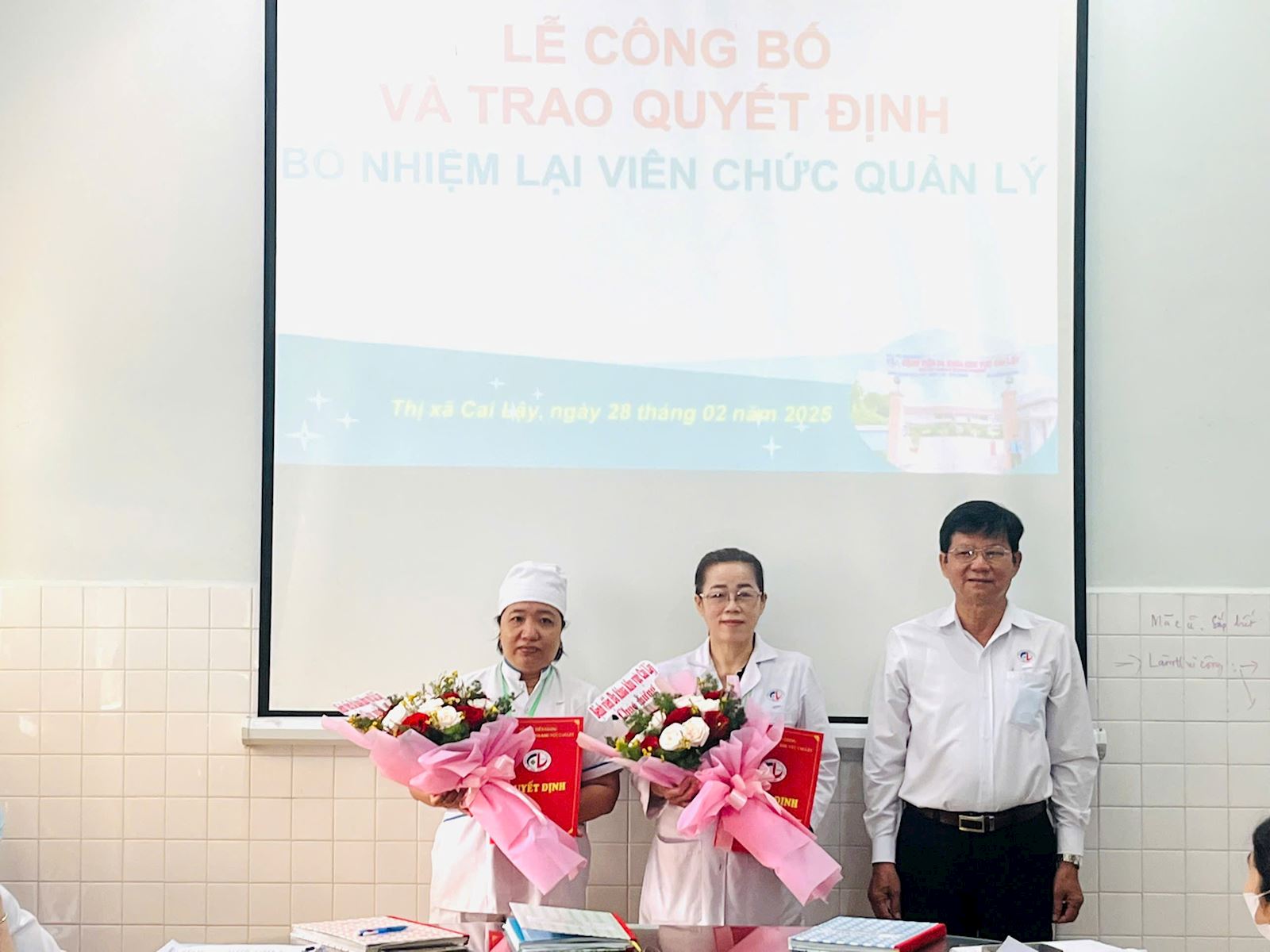 trao quyết định bổ nhiệm lại cho bà Trần Thị Hồng Tâm và bà Đinh Thị Xem.